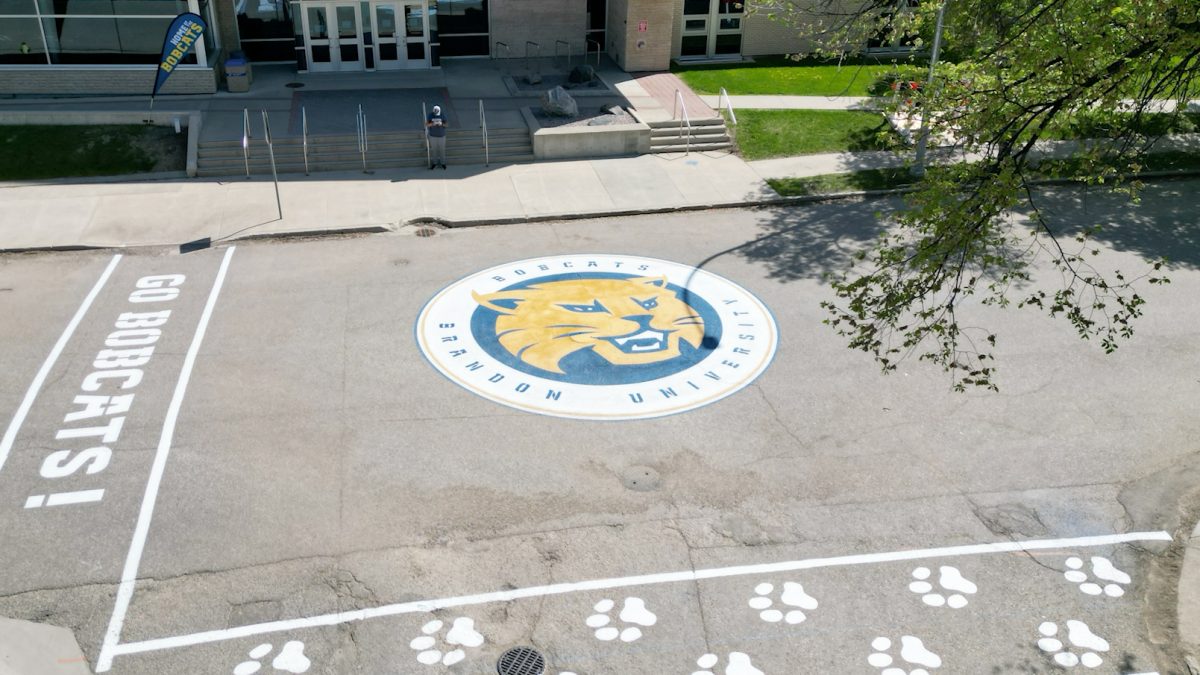 A massive new BU Bobcats logo greets visitors at the entrance to the Brandon University Healthy Living Centre. Painted directly on the asphalt in the intersection at 20th Street and Louise Avenue, the new logo was freshly installed just in time for Convocation.