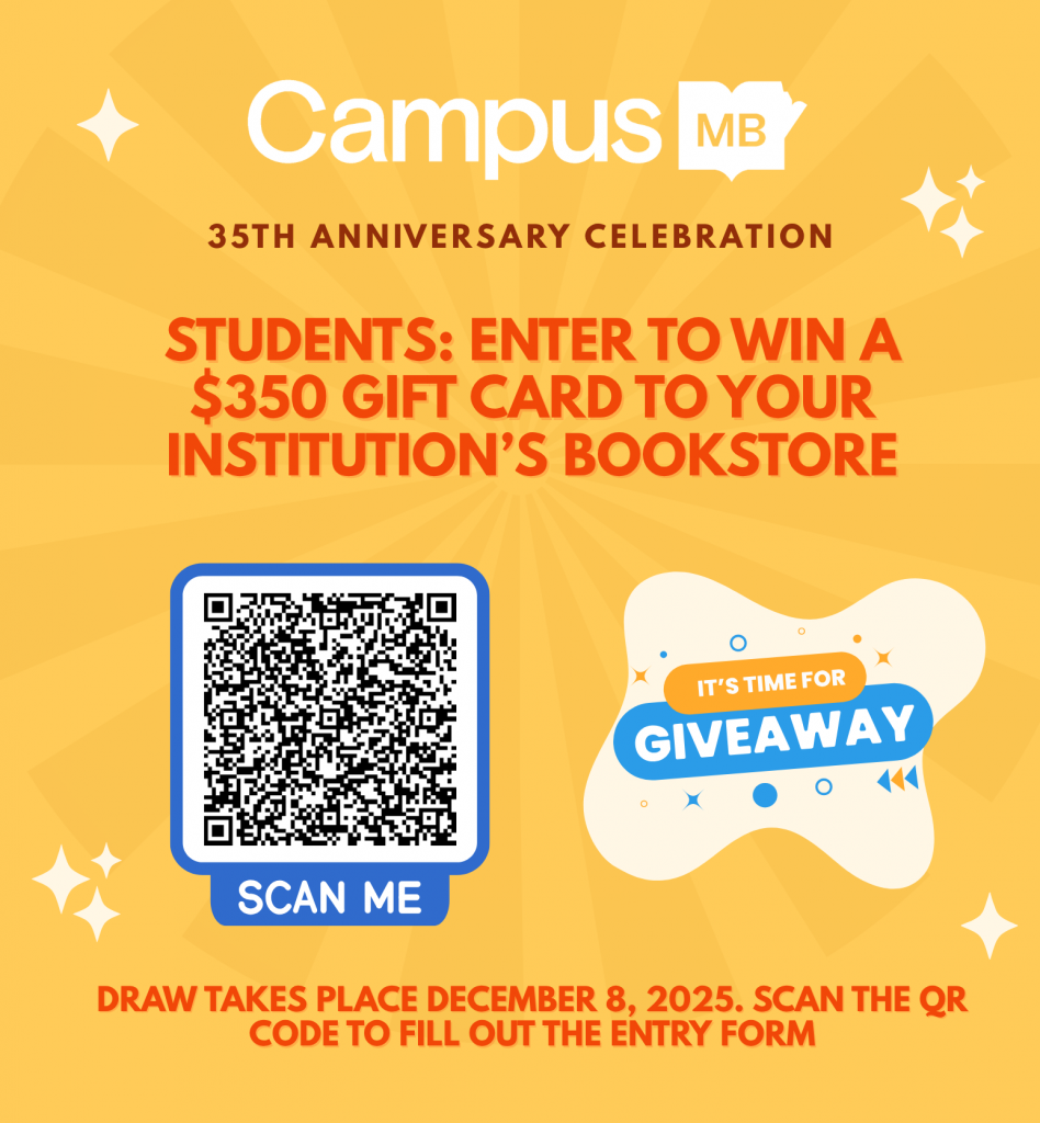 To celebrate this anniversary, Campus Manitoba is doing a Gift Card Giveaway contest! One lucky student will have the chance to win a $350 Gift Card to their institution’s bookstore. To enter, students must be currently enrolled in the 2025 fall term at one of Campus Manitoba’s partner institutions: Assiniboine College, Brandon University, RRC Polytechnic, The University of Winnipeg, Université de Saint-Boniface, University College of the North, and University of Manitoba.